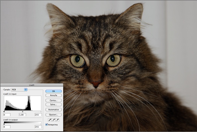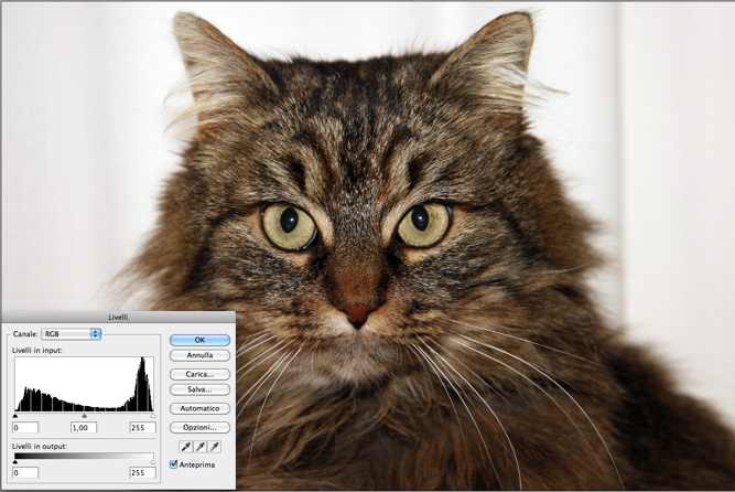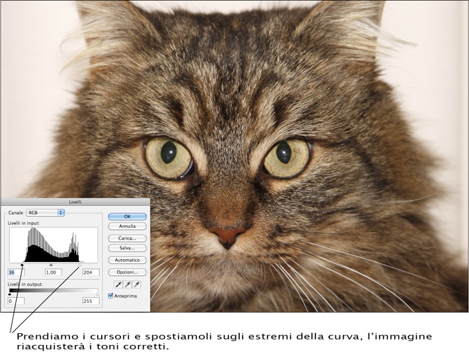 Possiamo anche provare ad usare il bottone AUTOMATICO per correggere l’immagine, (questo bottone si trova nella finestra livelli), il risultato non è sempre garantito, a volte i risultati sono strani e innaturali, è consigliato agire sui cursori del bianco e del nero, ed eventualmente quello centrale grigio, che corrisponde ai toni intermedi.