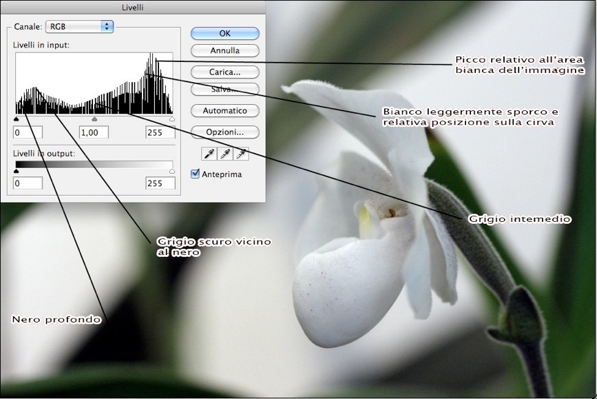 Nelle figure in basso, è visibile l’istogramma, relativo ai livelli di Photoshop. Un buon istogramma, deve avere una curva che si estende dal valore 0 al valore 255 (come visibile dal grafico dei livelli), dove 0 corrisponde al valore del NERO assoluto e 255 al valore del bianco assoluto. Se la curva si estende da 0 a 255 l’immagine è corretta, se la curva è incompleta, l’immagine è sovraesposta o sottoesposta. Nelle recenti macchine fotografiche, è possibile vedere immediatamente l’istogramma dopo lo scatto, questo può aiutarci a capire se stiamo facendo errori in fase di ripresa o se stiamo lavorando bene. Nell’esempio sotto, foto dell’orchidea bianca, possiamo vedere come l’istogramma agisce sull’immagine nei vari punti dell’immagine.